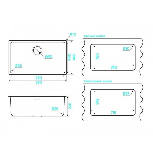 Описание Мойка  изготовлена из нержавеющей стали, обладающей высокой коррозийной стойкостью, большим запасом механической прочности, а также устойчивостью к воздействию кислот и других химически активных соединений. Устойчива к термическим воздействиям. Устойчива к образованию ржавчины. Не задерживает загрязнения на поверхности. Безопасна для здоровья. Легка в уходе и чистке. Материал - Нержавеюща сталь AISI304  Мебельная база - 80 см Тип монтажа - Универсальный (подстольный+врезной) Размер мойки - 760х440 Размер чаши - 720х400 мм Глубина чаши - 220 мм Радиус - R-25 Метод производства - двойная штамповка Толщина материала - 1,0 мм Комплектация • Комплект крепежа (2 типа) • Слив + Перелив • Сифон с подключением ПММ • Гофрированный шланг слива