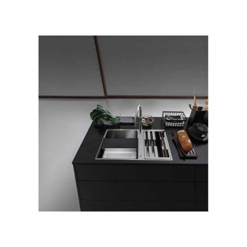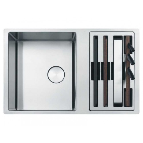Описание Мойка из нержавеющей стали Franke Box BWX 120-41-27 шириной 82 сантиметра. Модель Premium класса представлена с рабочим центром справа и слева. Прямоугольная раковина с полировкой поверхности устанавливается под столешницу. Устойчивость к механическим повреждениям и резким перепадам температур Вашей модели обеспечивает материал сталь марки AISI 304. Любимый материал профессиональных шеф-поваров легко чистится. Многофункциональная кухонная раковина укомплектована: 2 разделочными досками (пластиковая и деревянная), миской из нержавеющей стали, тремя ножами (специально для хлеба, овощей, мяса/рыбы), деревянный держатель для ножей. Аксессуары размещаются на краях чаши или полностью закрывают ее, выполняя функцию крыла. Размер мойки: 820 x 520 мм Размер чаш: 410 x 480 x 200, 270 x 480 x 200 см Вырез для монтажа: 780 мм х 490 мм Сформированные отверстия с обратной стороны: 2 x 35 мм Вентиль-автомат в комплекте, выпуск 3,5", Круглая декоративная крышка для слива: в большой чаше Крепления: крепления fastfix® обеспечивают легкий монтаж мойки в столешницу толщиной от 12 мм, Монтажный фланец для установки смесителя в комплекте