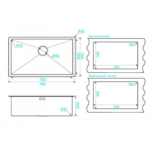 Описание Мойка  изготовлена из нержавеющей стали, обладающей высокой коррозийной стойкостью, большим запасом механической прочности, а также устойчивостью к воздействию кислот и других химически активных соединений. Устойчива к термическим воздействиям. Устойчива к образованию ржавчины. Не задерживает загрязнения на поверхности. Безопасна для здоровья. Легка в уходе и чистке. Материал - Нержавеюща сталь AISI304  Мебельная база - 80 см Тип монтажа - Универсальный (подстольный+врезной) Размер - 740х440 мм Глубина чаши - 200 мм Радиус - R-10 Метод производства - сварная, ручное производство Толщина материала - 1,2 мм Комплектация • Декоративная накладка на слив • Комплект крепежа (2 типа) • Слив + Перелив • Сифон с подключением ПММ • Гофрированный шланг слива
