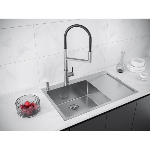 Описание Функциональное плоское крыло; Готовое отверстие для кухонного смесителя. Имеет шумопоглощающее покрытие Stille® на внешней стороне чаши; Не подвержена деформации; Выдерживает большой вес посуды и продуктов; Бесшумна под напором струи воды; Устойчива к термическим воздействиям; Устойчива к образованию ржавчины; Не задерживает загрязнения на поверхности; Безопасна для здоровья; Легка в уходе и чистке; Материал-Нержавеющая сталь,брашированная Гарантия-5 лет Монтаж-вровень со столешницей/врезной Габариты (ш.д.г.)-780x510x200 мм Размер кухонного блока-600 мм Монтажная ширина-760 мм Монтажная длина-490 мм Ширина чаши-470 мм Длина чаши-410 мм Глубина чаши-190 мм Толщина мойки-1,2 мм Диаметр слива-114 мм Радиус угла-R10 Готовое отверстие под смеситель-есть Расположение крыла - справа