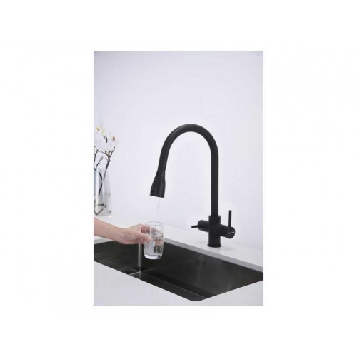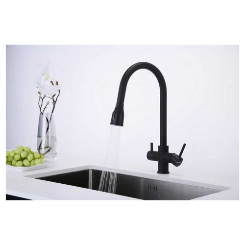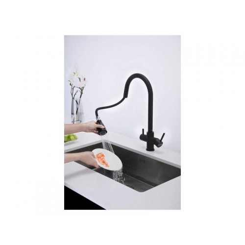 Конструкция смесителя с вытяжным шлангом значительно облегчает процесс мойки посуды или продуктов любого размера и формы.